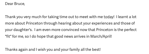 Like many schools, Princeton doesn’t require all applicants to be interviewed by an alumnus/alumna of the school. However, given Princeton’s extensive alumni network, they have active alumni interviewers in a wide range of cities and areas. My personal experience with the alumni interview was a very rewarding experience, because the interview took place in the interviewer’s office (Bloomberg Hong Kong), and he also shared a lot about his own undergraduate experience as well as that of his daughter, who was then a sophomore at Princeton.