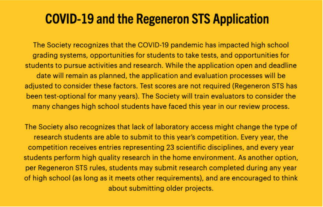 Founded in 1952, STS is a unique competition in that its mission is to find future leaders in science and not just showcase impressive science projects. (That said, many Regeneron ISEF participants also submit their science research projects to Regeneron STS. You can apply to both with the same project if it fulfills STS requirements. If you’re curious to learn more about the Regeneron ISEF competition, see our complete guide for high school students here .)