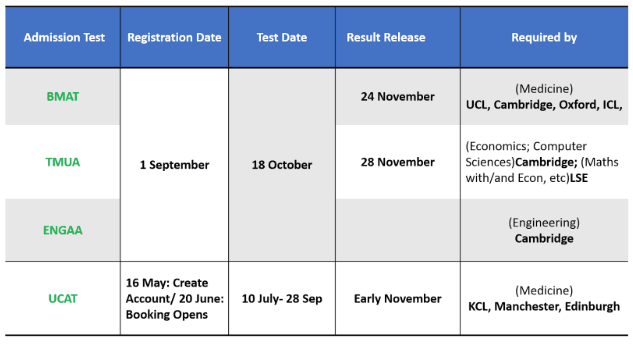 Competitive universities and subjects likely require applicants to take specific admission tests, which are typically administered around October or November of a given application year (with a few exceptions that run into the subsequent calendar year). International applicants would need to register for the tests themselves through the British Council, unless their school is a registered exam center. The majority of registration dates are in May or September and candidates should prepare thoroughly and early as these tests can only be taken once. Some tests, such as the UCAT (required by medicine majors at King's College London, University of Bristol, University of Edinburgh etc), assesses reasoning abilities, whereas others such as the ENGAA (required by Engineering department at Cambridge), assesses subject knowledge such as math and physics; on the other hand, LNAT (required by most law schools) tests logical deducting and ethical arguments.