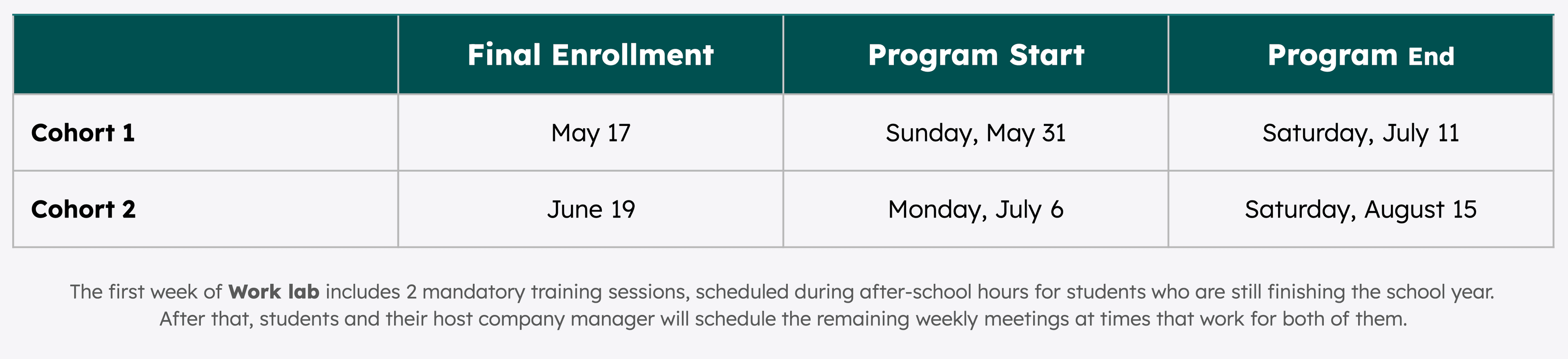 Polygence runs multiple Work Lab cohorts during Summer, each offering unique project opportunities and its own application deadline. Each cohort lasts 6 weeks: you'll start with around 10 hours of focused training, then move on to roughly 40 hours of project work, which can be completed at your own pace within the program period.